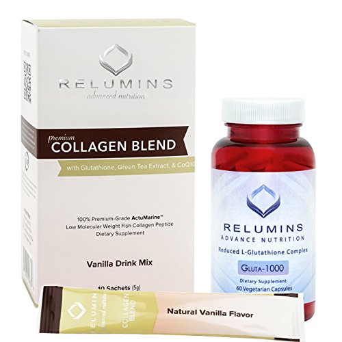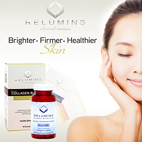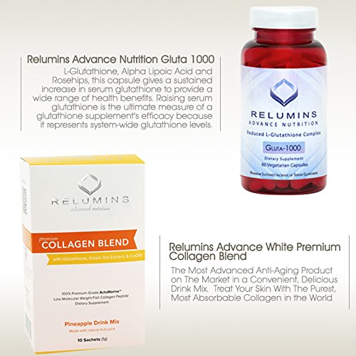 Studio : Relumins Publisher : Relumins Binding : Misc. Product Description The Most Advanced Anti-Aging Product on The Market in a Convenient, Delicious Drink Mix. Treat Your Skin With The Purest, Most Absorbable Collagen in the World. Relumins Advance Nutrition is proud to present a new oral glutathione formula, Gluta-1000. Packed with 1000mg of Reduced L-Glutathione, Alpha Lipoic Acid and Rosehips, this capsule gives a sustained increase in serum glutathione to provide a wide range of health benefits. Raising serum glutathione is the ultimate measure of a glutathione supplement's efficacy because it represents system-wide glutathione levels. 0
