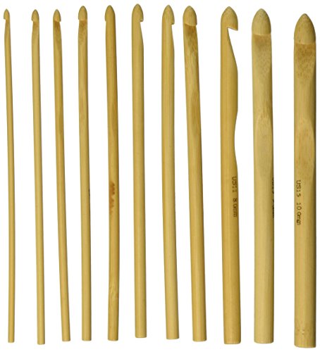 - Set of 6" Bamboo Crochet Hooks with bead end handle, 11 sizes. 1 hook per size. Natural pale finish.