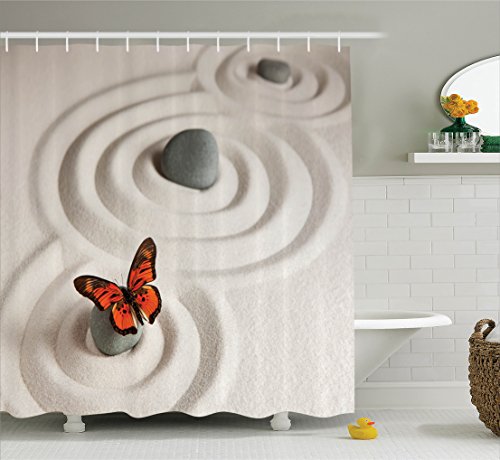 Butterflies Decoration Shower Curtain Set By Ambesonne, Zen Rock On The Sand Butterfly Serenity Life Cycle Nature Meditation Decor, Bathroom Accessories, 75 Inches Long, Beige Orange