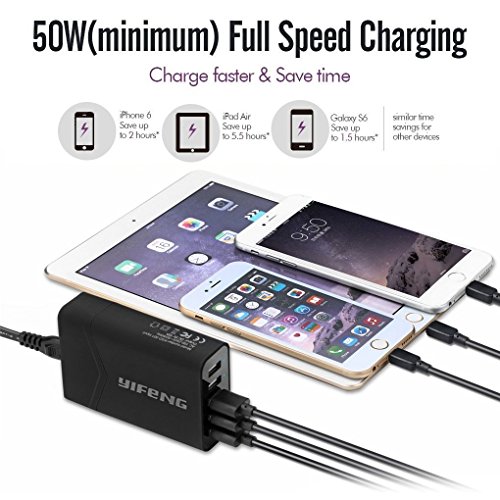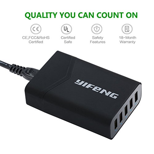 -. Feature : COMPACT DESIGN: Portable travel smart desktop / wall charger for cellphones, tablets and other devices. Small and compact, easy to carry, home travel essential, 5-Port simultaneous charging, 100-240 volt input ideal for international travel / QUICK CHARGE 2.0 TECKNOLOGY: Each USB port intelligently identifies your devices and delivers its fastest possible charge speed up to 2.4 amps per port or 10 amps overall / STABLE COMPATIBILITY: Works perfectly with all IOS and Android devices, including Bluetooth speaker, or other devices charged with usb / GUARANTEED SAFETY: Fully certified by CE, FCC design, industry grade materials and premium circuitry ensure superior performance and reliability. Multiple built-in safeguards protect against over-current, overcharging and overheating for safe and fast charging / QUALITY GUARANTEE: YIFENG 50W 5-Port Desktop / Wall Charger, 6.4ft / 195cm detachable power wire, our fan-favorite 12-month warranty and friendly customer service