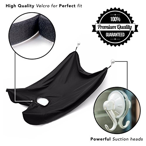 Easy to setup and use.Just wear the apron with velcros at one end and attach the other side with suctions cups to the mirror and good to go.