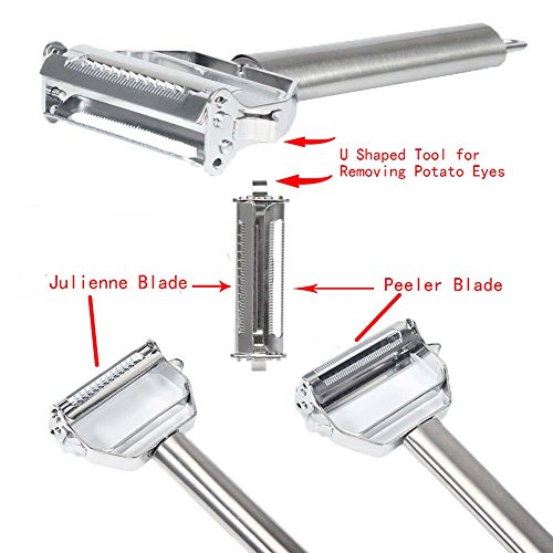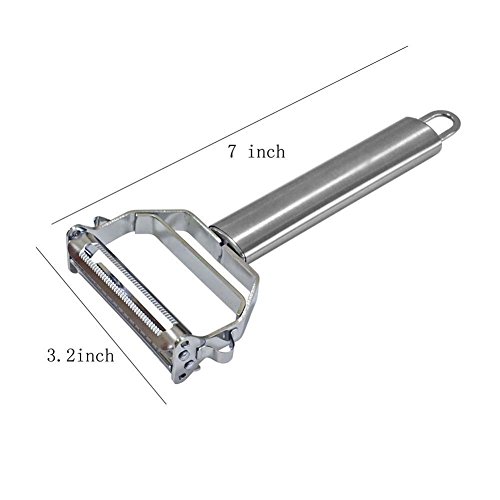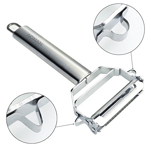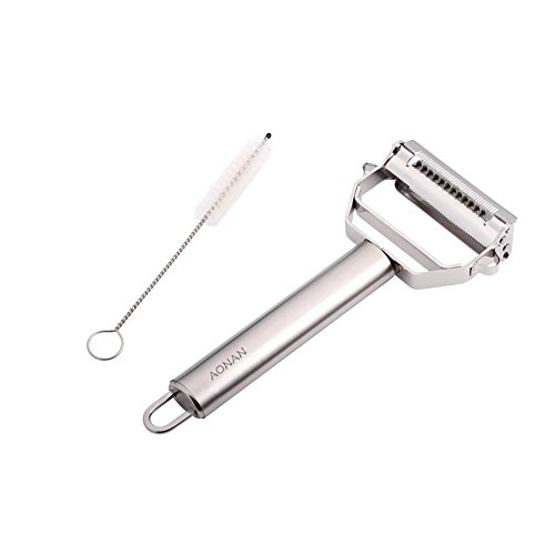 - Now includes SPECIALIZED CLEANING BRUSH specifically designed to clean the small AONAN blades! 4-in-1 KITCHEN MULTI TOOL: This amazing peeler and slicer shaves away the outer layers of vegetables and fruits with ease. Julienne Peeler, Zucchini Slicer, Vegetable Peeler, and Eye Scoop. Great for Potato, Apple, Squash, and as a Carrot Peeler, Citrus Garnish Tool, and for creating a delicious bowl of Zucchini Noodle.