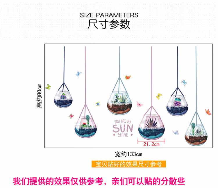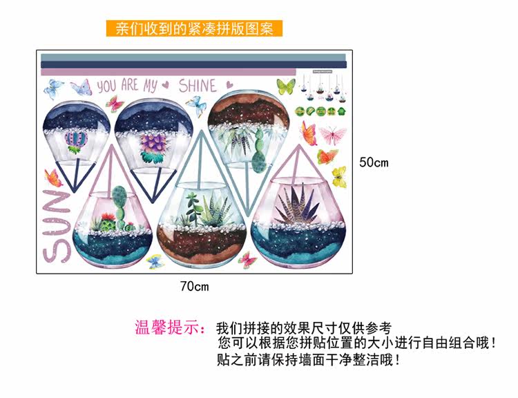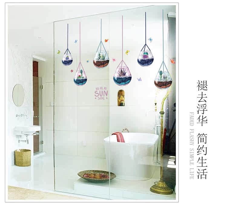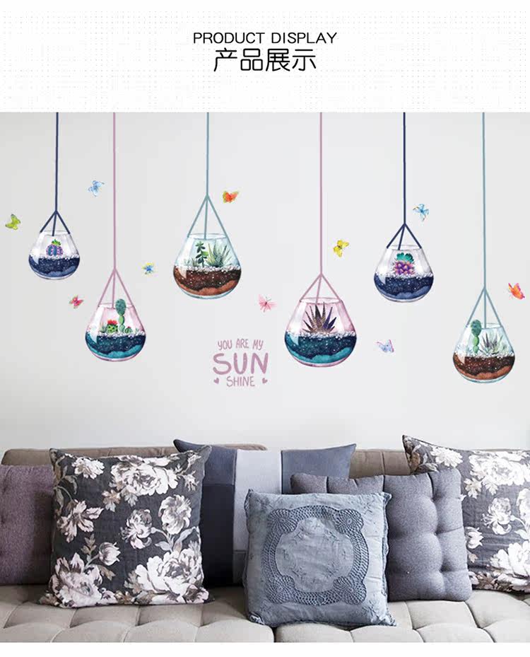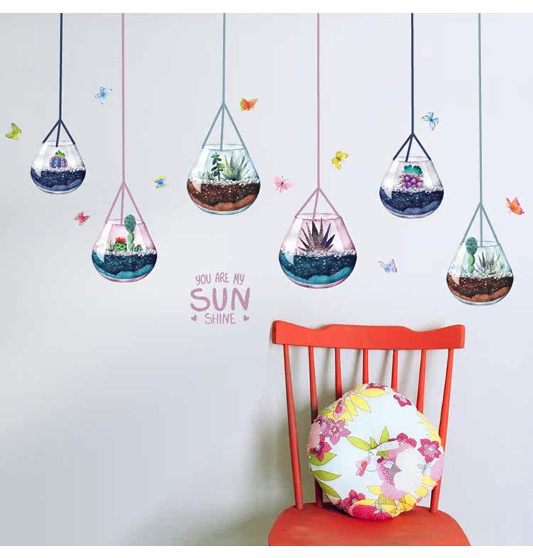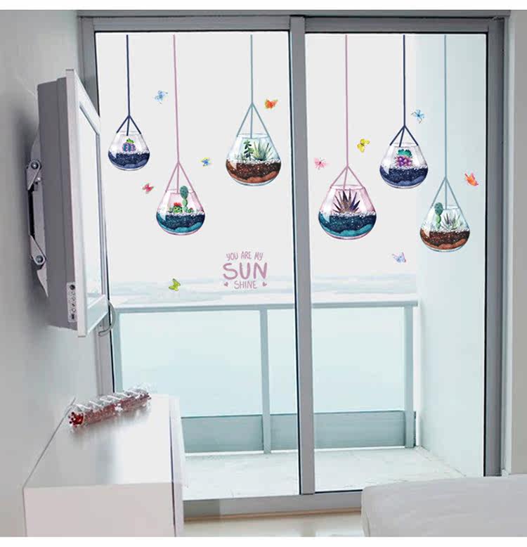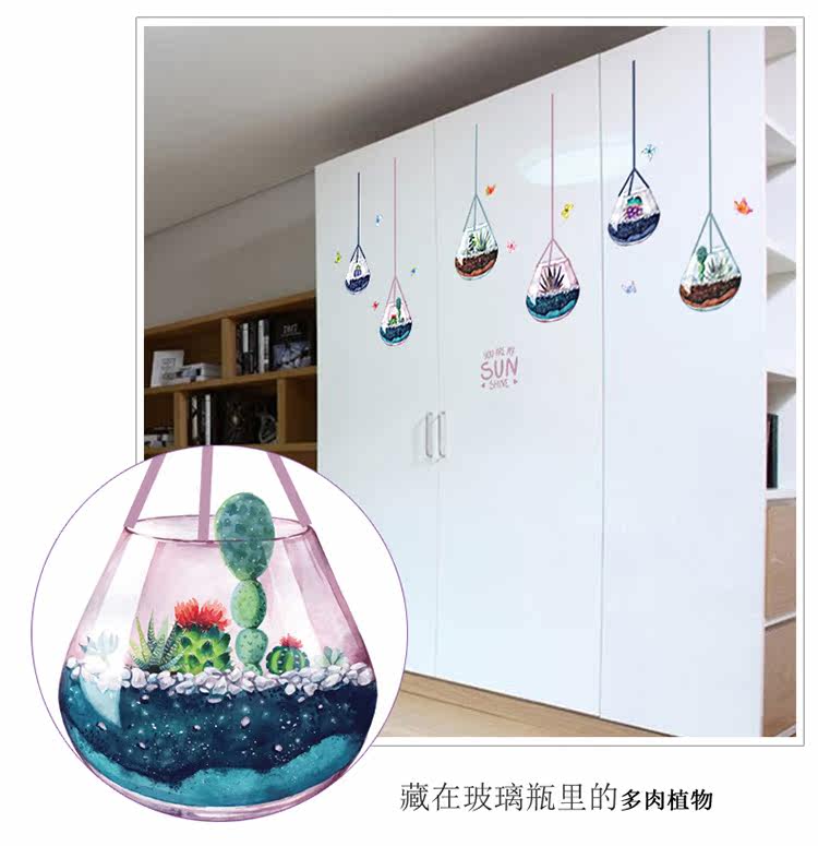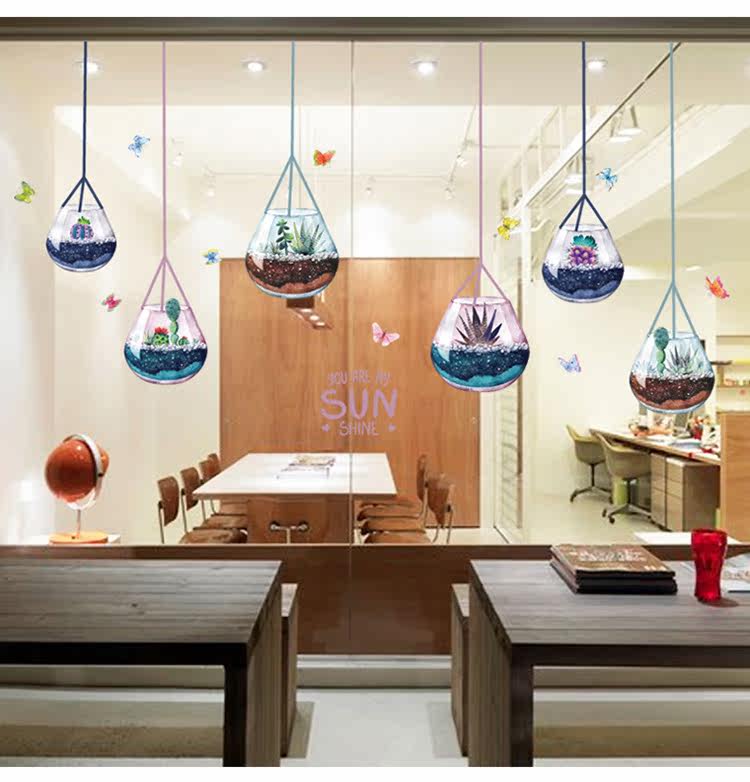 客厅电视沙发背景墙创意玻璃装饰多植物肉盆载可移除墙贴纸贴画