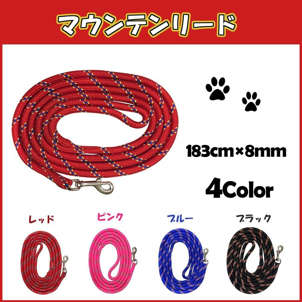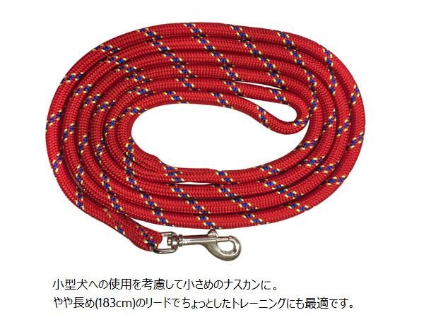 | マウンテンロープで作られた丈夫なリードです。やや長め(183cm)のリードでちょっとしたトレーニングにも最適です。小型犬への使用を考慮して小さめのナスカンが付いています!! |