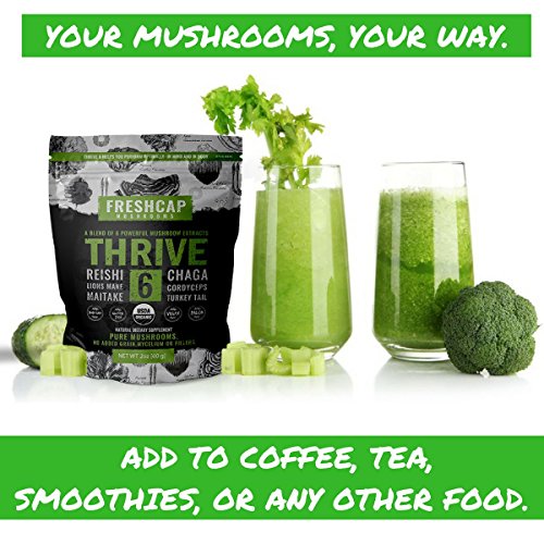 -. Feature : ORGANIC | POWERFUL: Our mushroom supplements are 100% natural, USDA Certified Organic, Non-GMO, Gluten Free, Vegan and Paleo friendly. Cultivated naturally in greenhouses and shade-houses, with constant fresh air, natural light and fresh water. No agricultural chemicals are used in the process of growing our mushrooms. To guarantee purity and quality, every crop of mushrooms is tested to ensure no unhealthy contamination from chemicals or heavy metals. / TESTED AND VERIFIED EXTRACTS: This blend contains potent extracts of 6 powerful mushrooms: Lions Mane, Reishi, Chaga, Cordyceps, Maitake and Turkey Tail. Our mushroom extracts are analytically tested and scientifically verified to contain greater than 28% beta-glucans, which are the beneficial compounds you're looking for. We use WHOLE MUSHROOM FRUITING BODIES with no filler, mycelium, extra starch or grains. / WHY YOU NEED MUSHROOMS: Taking a mushroom supplement can improve your focus and mental clarity (Lions Mane), boost your immune system (Maitake, Turkey Tail, Reishi), detoxify and revitalize your body (Chaga), and improve your strength and endurance (Cordyceps)*. / EASY TO USE: Easily add THRIVE 6 mushroom powder to smoothies, coffee, tea, or food. Scoop included. For beverages, stir well and often for best results. Use daily. The food grade packaging is completely re-sealable. / YOUR SATISFACTION GUARANTEED 100%: We want you to feel amazing and be happy. If for any reason you are unsatisfied with a FreshCap Mushrooms product, we'll make it right with a complete refund. No questions asked. Get what you'd expect from a premium mushroom supplement.