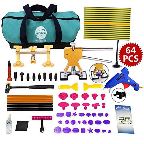 - MOST PRO & COMPREHENSIVE PDR TOOLS KIT – Totally 64 PCS, including the most classic and popular tools like Golden Dent Lifter, Newest Reflector Board, New Style Pop-A-Dent, Pro Hot Melt Glue Gun & Sticks, Mini Dent Puller, Pulling Tabs, Knockdown, Rubber Hammer etc.