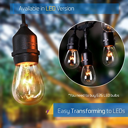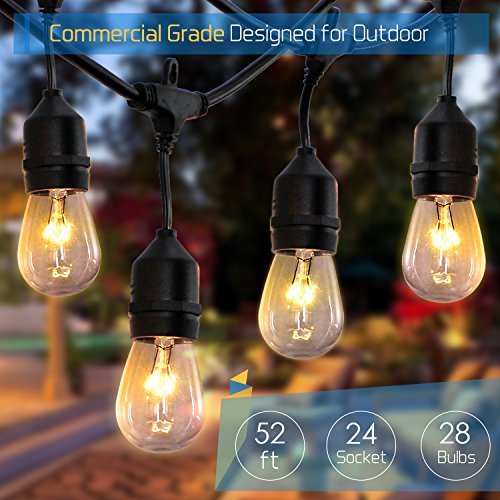 52 ft Outdoor String Lights Commercial Grade Weatherproof - UL Listed Heavy Duty - 24 Hanging Sockets - Perfect Patio Lights Bistro Market Cafe Lights - 28pack 11W Incandescent Bulbs Included