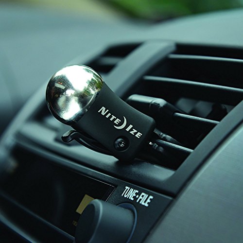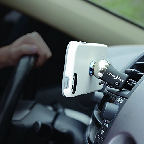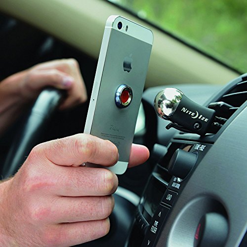 Nite Ize - Steelie Car Vent Mount Why shouldn't your car phone holder have brilliant, intuitive design? Meet the Steelie Car Mount. Our popular magnetic car phone holder is a cell phone car mount, iPhone car mount, or any smart phone mount that is sleek, compact and totally secure. Adjusts and holds in any viewing angle, whether portrait, landscape, or moved out of sight. This all-inclusive car mount kit includes one Steelie Magnetic Phone Socket with 3M VHB adhesive pad, one Steelie Ball Mount with Vent Mount clips, an alcohol prep pad, and easy car phone holder installation instructions. Simply attach the circular magnet to the center of your phone, attach the steel ball mount to any vent, and let magnetic power do the rest. Speed bumps, potholes, quick turns? No problem. The Steelie Car Mount Vent kit is made with high-quality steel, machined aluminum, flexible silicon and 3M adhesive pads. Because of its fumble-free design, unlike other car phone holders, the Steelie Car Mount kit is legal in all 50 United States. Plus, when you reach your destination and detach your phone from the smart phone or iPhone car mount, the Magnetic Phone Socket lets you attach your phone to any other convenient metal surface! Refrigerator doors, metal shelving, filing cabinets, you name it. This car phone holder works with any and all mobile devices, as a cell phone car mount, iPhone car mount, or any smart phone mount, using strong magnets that will not damage your tablet or phone. Measures a functional 1.14" x 1.06" x 1.06" and weighs 2.5 oz. Compatible with other Steelie system components.Feature