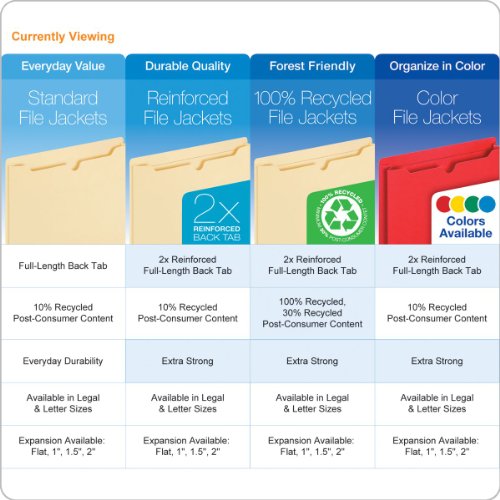 -. Feature : Durable manila construction / Single-top reinforced tab extends ½" above the front for easy labeling / Contains 10 percent post-consumer recycled content / Expansion of 1.5 Inches / For letter size documents, box of 50 jackets