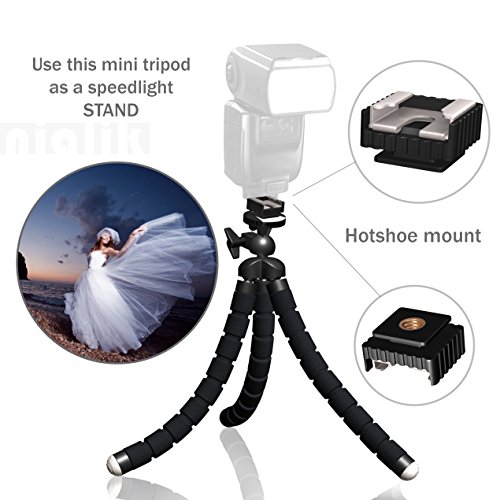 SPEEDLIGHT HOT SHOE MOUNT: Nialik bendable tripod features a SPEEDLIGHT hotshoe mount. With the speedlight adapter you can use this mini tripod as a speedlight STAND. This is perfect choice if you need SPEEDLIGHT BRACKET. We stand by our products and we are so confident to offer you 90-day MONEY BACK guarantee.