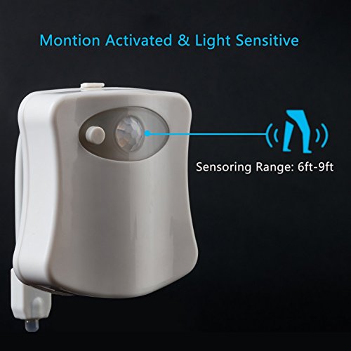 - Motion Activated Toilet Bowl Light - Detection distance is 2-3 meters (6-9 feet), and toilet lamps combined with the night vision of the visual positioning system, it can also change between 8 different colors to indicate the location.