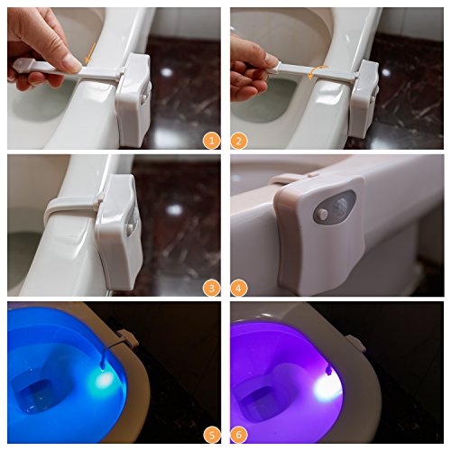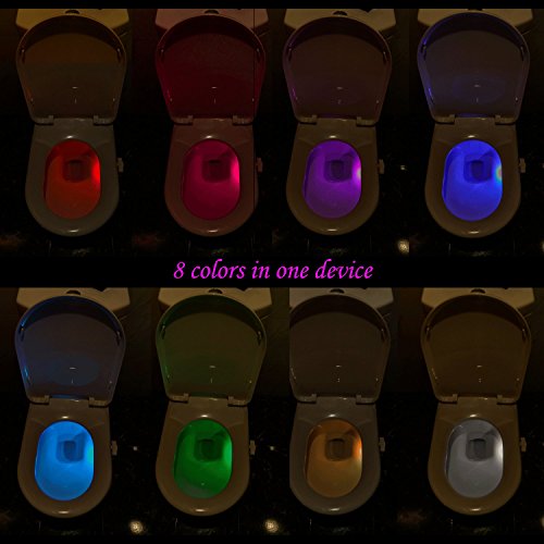 - 8 LED Colors with 2 Modes - You can choose a single color that suits you or use carousel mode and let the unit cycle seamlessly between 8 different colors. 8 color changing toilet night light with two modes, press the button to fix one single color that you like, press again to let 8 colors rotate, colors are changing randomly every 15 seconds and 120 seconds overall for one cycle.