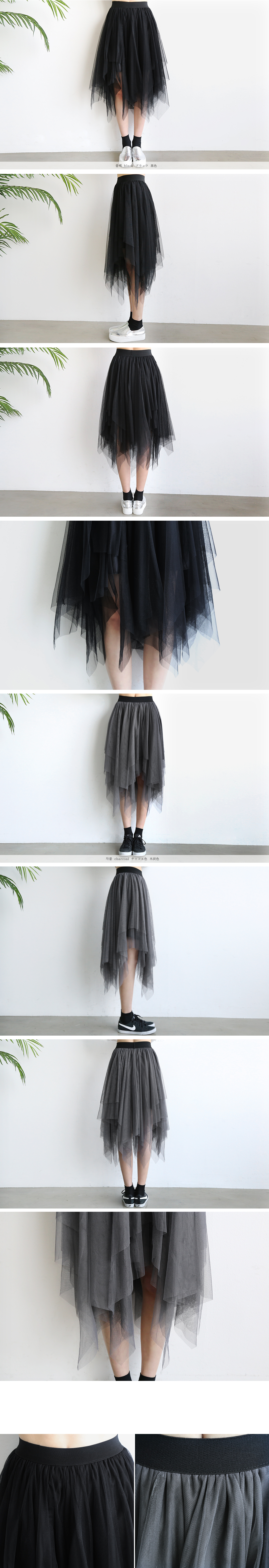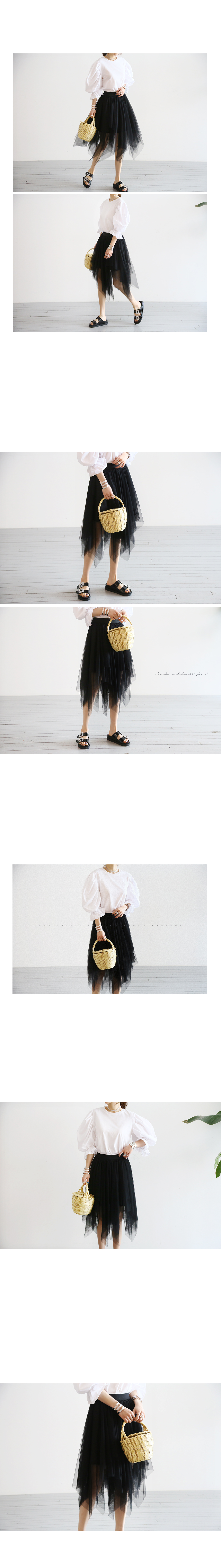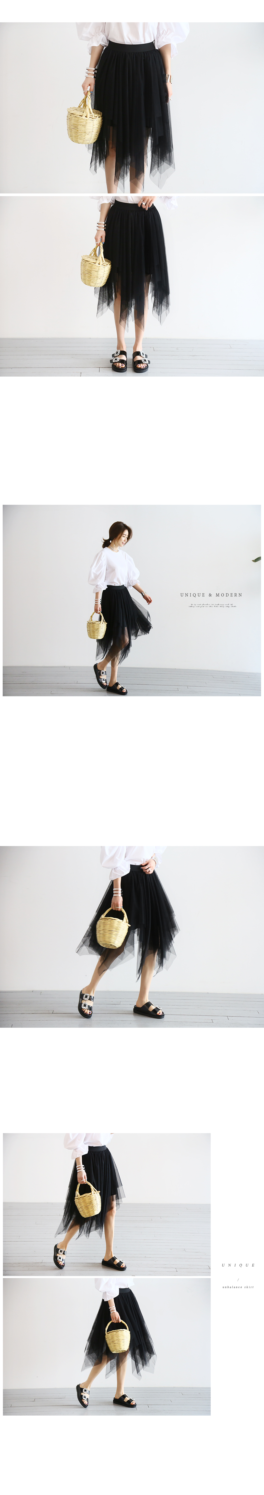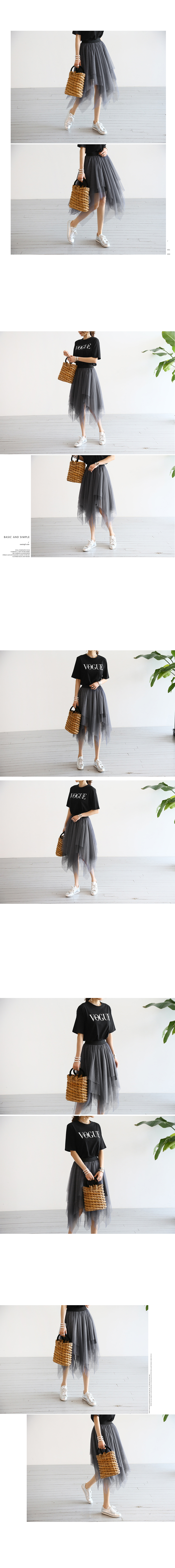 밑단이 사선으로 언발란스하게 재단되어 걸을때마다 살랑살랑 움직이는 모양이 예쁘고요모델 언니처럼 기본티에만 코디해도 러블리한 룩을 만들어주어 유용한 아이템이에요.