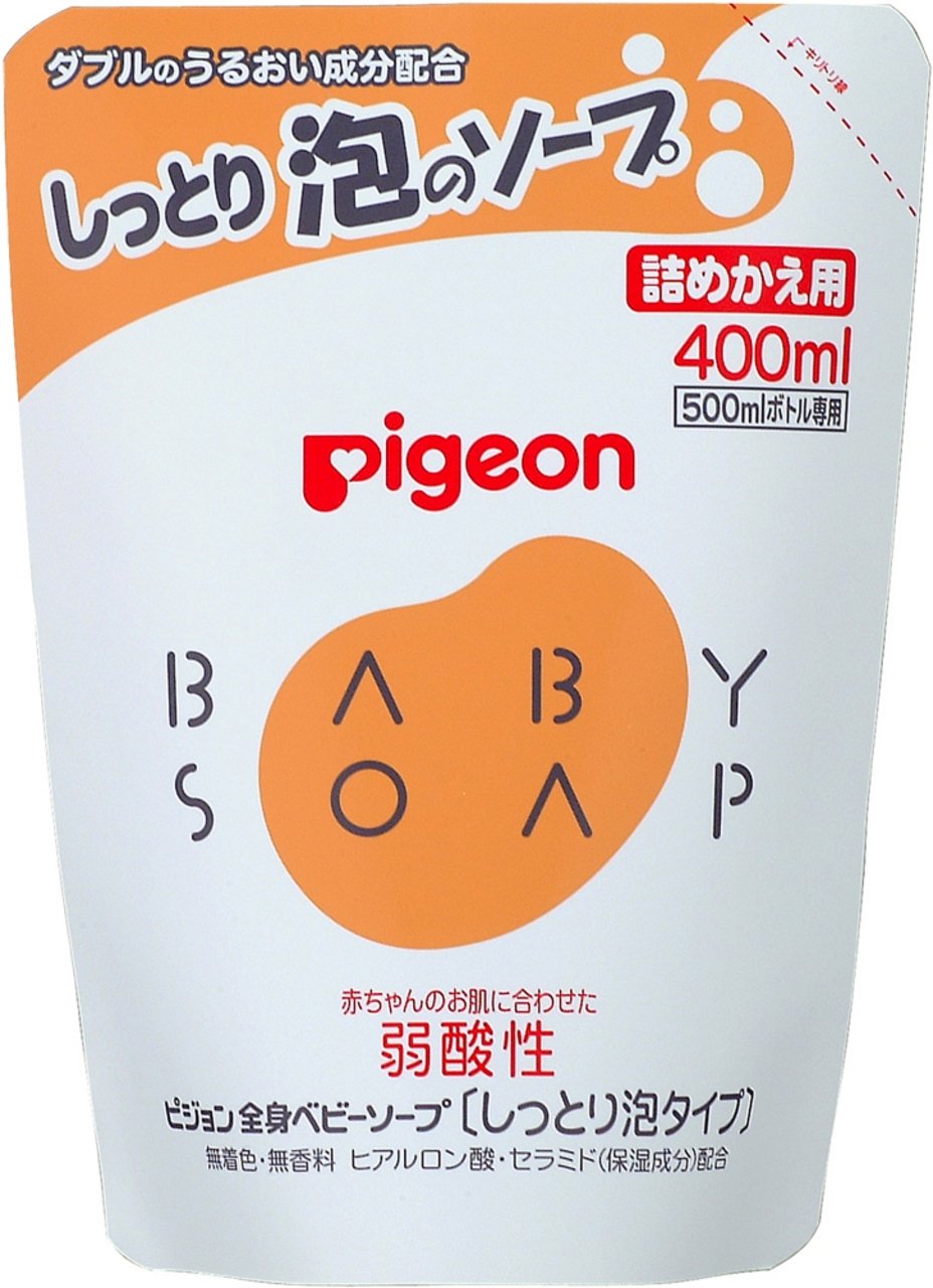"Pigeon whole body baby soap (moist foam type) for refilling 400ml" is a baby body shampoo that focused on the weak acidity value of your baby's skin.