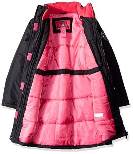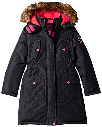 Attached hood is trimmed in faux fur