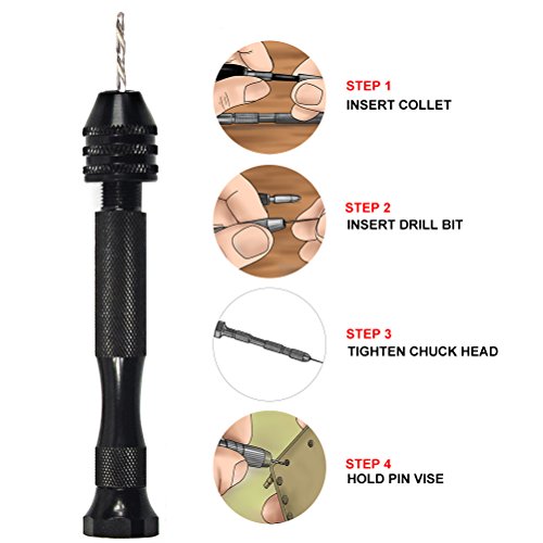 Product Features: Drill pin vise has a 3-jaw hardened steel keyless chuck and sturdy plastic handle that is ergonomic and easy to hold.High quality alloy.This miniature hand drill can hold slim drills bits tightly.