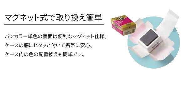 美しい発色と豊かな色調のパンカラーのセット。パンカラーの裏面はマグネットになっており、ケースの底にぴったりと付いて携帯におすすめです。 |