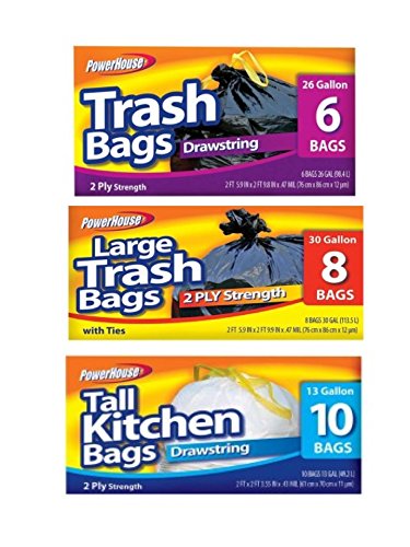 GARBAGE BAGS MULTIPURPOSE DOUBLE PLY WITH TIES 3 DIFFERENT SIZE FOR CONVENIENCE 30 GALLON 26 GALLON AND 16 GALLON
