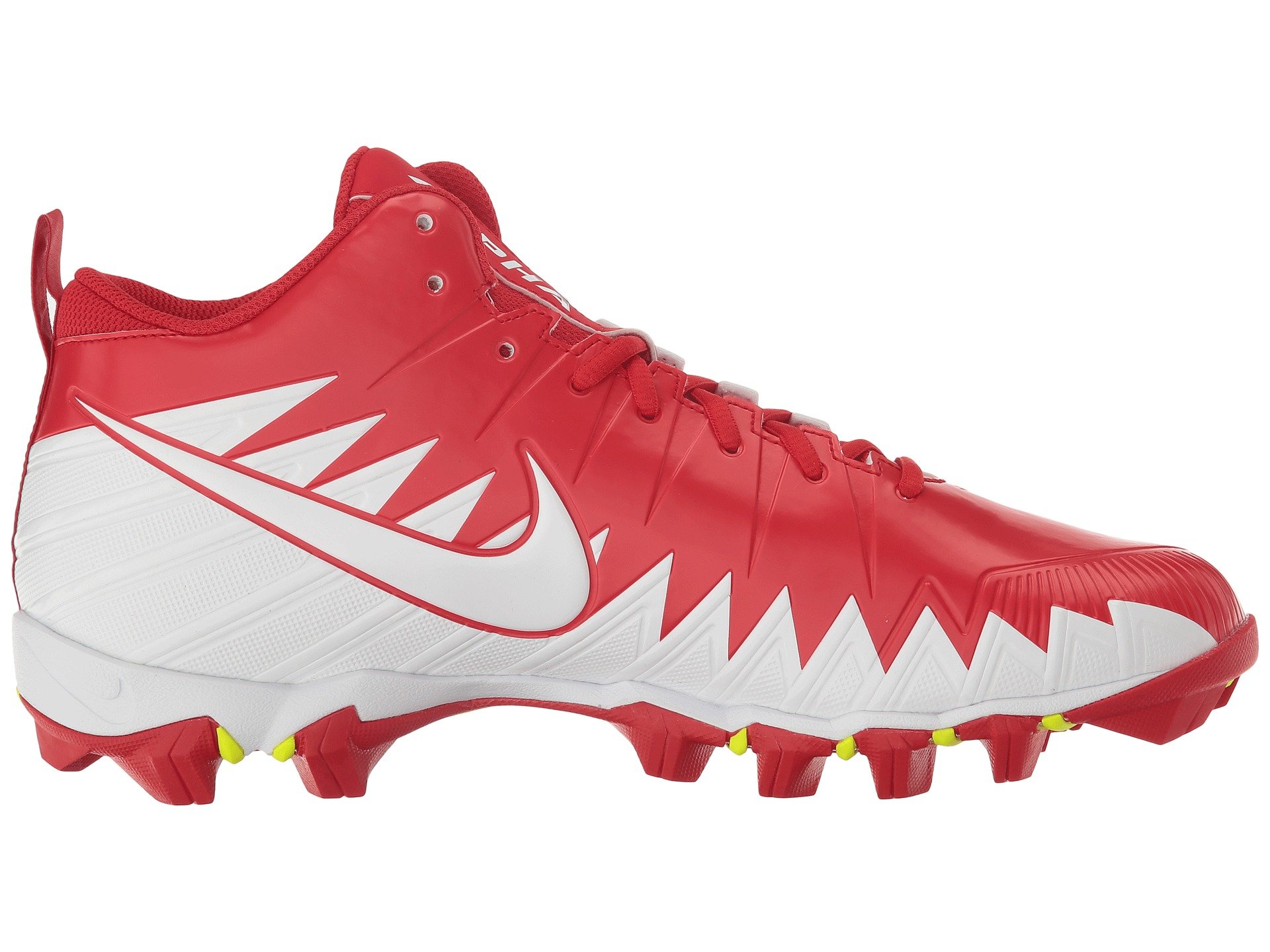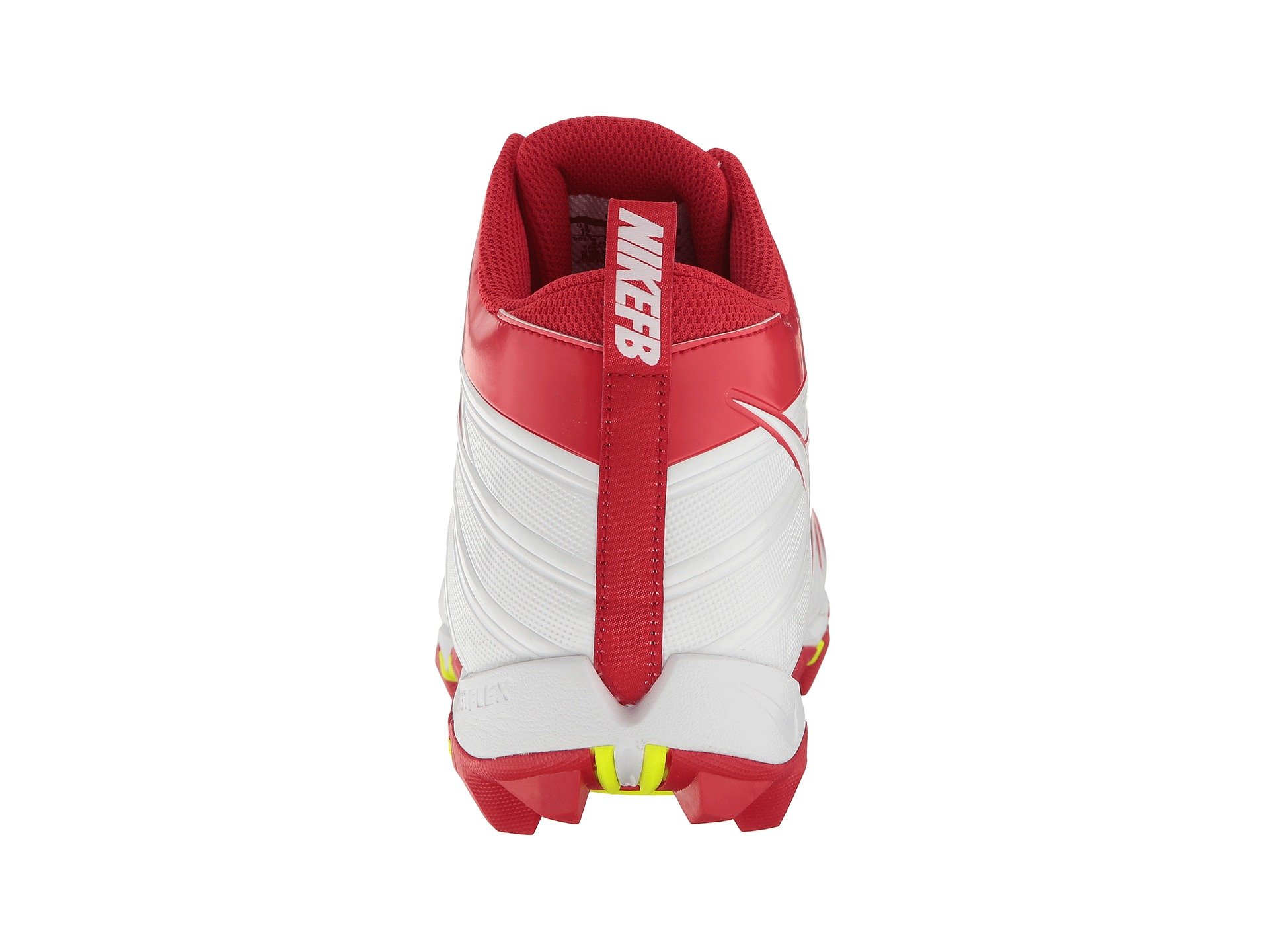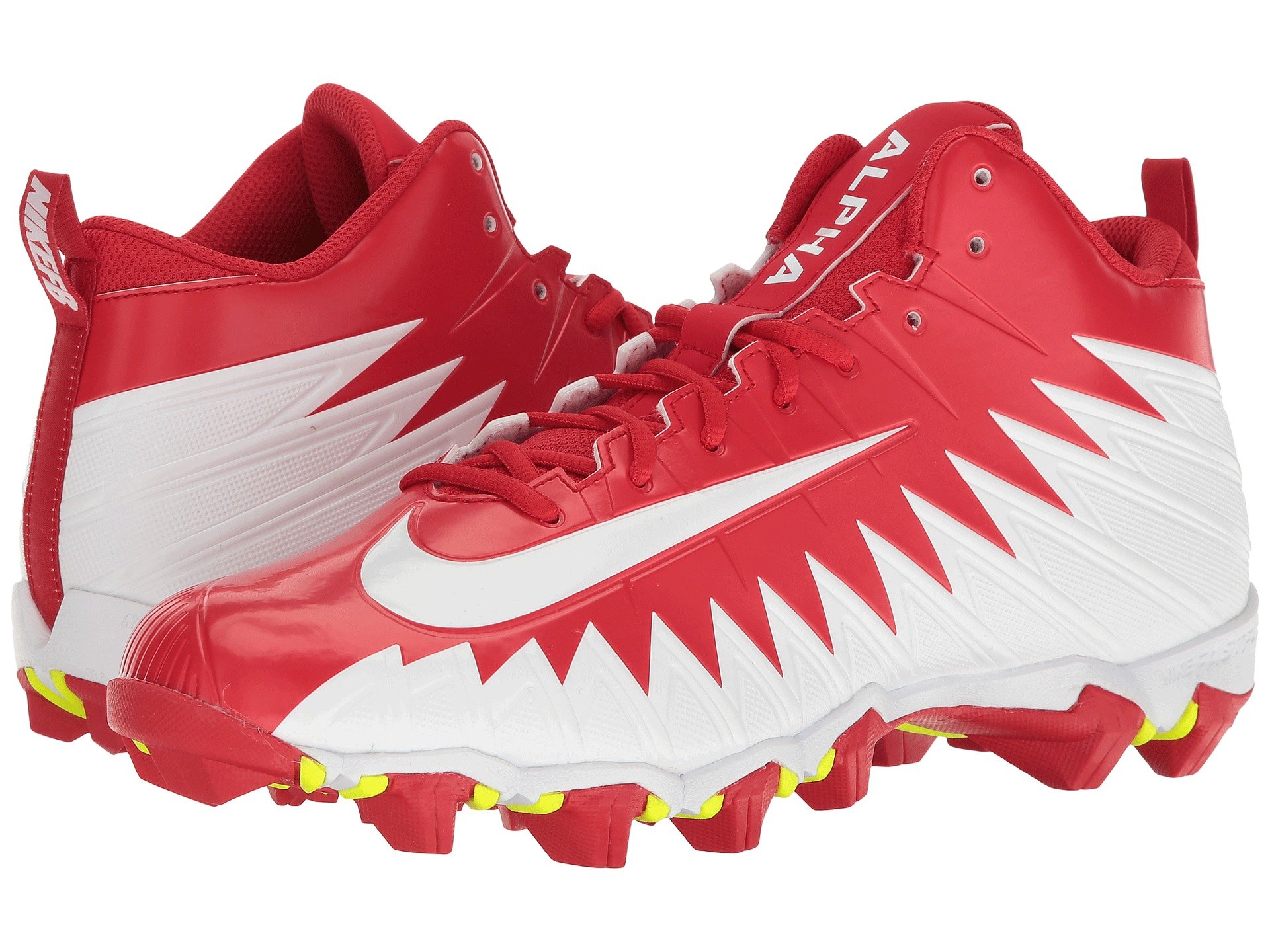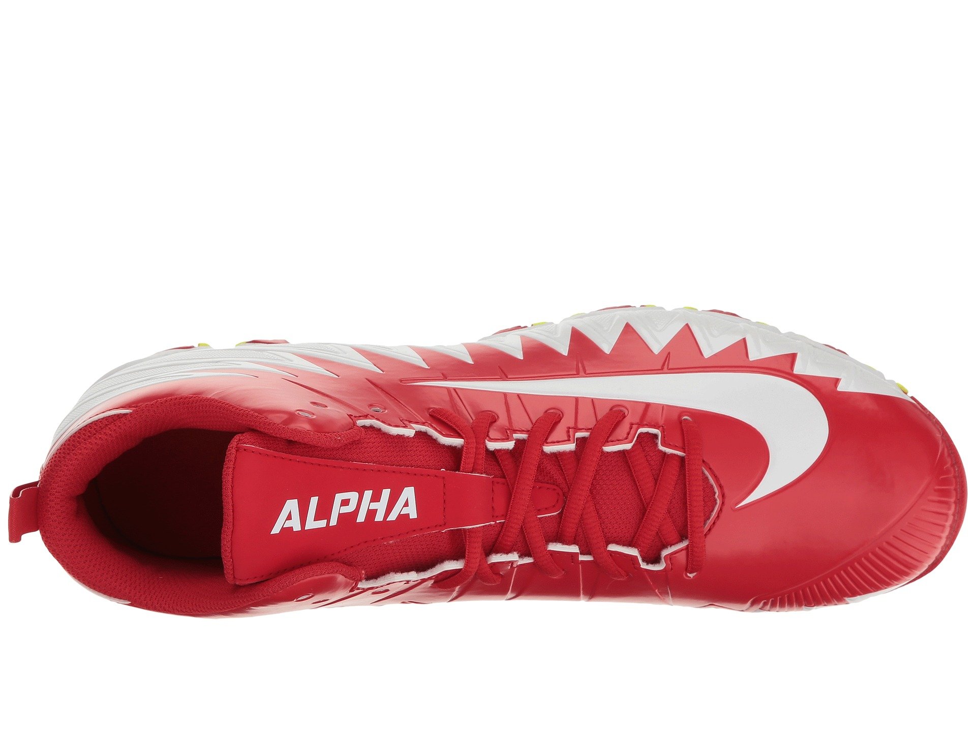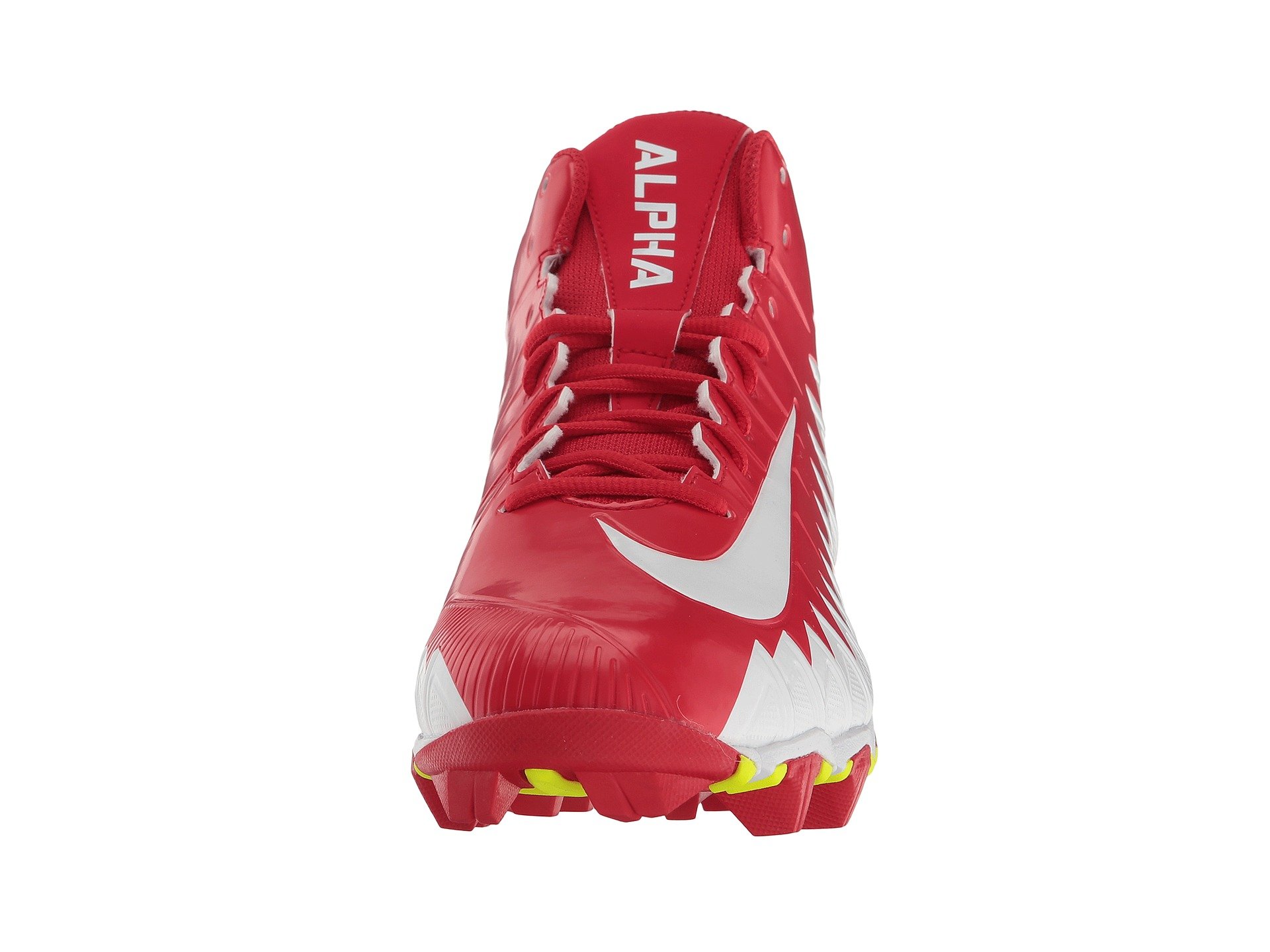 | Product Information SKU: #8846540Claim your bait on the field with the Nike? Alpha Menace Shark football cleat!Durable synthetic upper.Centralized lace-up closure for a secure, adjustable fit.Pull-on tab at rear creates an easier on and off wear.Padded tongue and collar provides support.Breathable mesh lining.FastFlex technology in sole promotes natural motion. Phylon foam cushioning delivers lightweight support for quicker runs. Rubber outsole with cleats provides multi-directional traction during practices and games. Imported.Product measurements were taken using size 12, width D - Medium. Please note that measurements may vary by size.Weight of footwear is based on a single item, not a pair.Measurements: Weight: 13 oz |