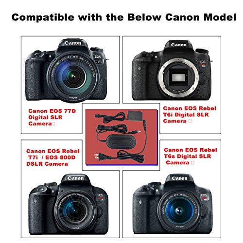Product Description100% Compatible with Canon! Compatible with: ---Canon T6i(750D)/Rebel T6S(760D) ---Canon T7i (800D) and Canon EOS 77D Packing List: 1 * AC Adapter 1 * DC Coupler 1 * Power Cable0