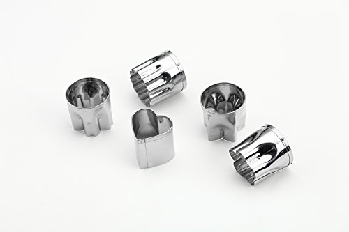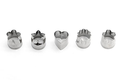 ★ Package included: 5 vegetable cutters including flower shapes, heart shapes and star shapes. ★ Size: Diameter 1 in (2.54 cm), High 0.94 in (2.4 cm). ★ Featrues: Pretty, Sharp, Cute and Fun To Use. ★ VARIETY OF USES: - Best for kid's lunch boxes or for snacks, desserts and bento boxes. These amazing vegetable cutters have fun shapes that graces your food with beauty by adding color and interest to it. Perfect for encourage kids to eat vegetable and increase their intelligence. - Perfect for cutting vegetable, fruit, bread, cheese, tiny cookies and fondant shapes. Including carrot, cucumber, cantaloupe, watermelon, kiwi, strawberries, apples, pineapple, pears, bananas, sandwich pieces and finger foods for babies. - Perfectly designed for all kinds of occasions, such as: Birthdays, Halloween, Valentine's Day, thanksgiving, Christmas, Baby Shower and Classroom Projects. - Fun To Use For Parties! WOW Your Family and Friends With Your Creative Food Platters and Cocktail Garnishes. The Mini Fruit Cutter Shapes Set makes your food unique and remarkable and you need to add it to your kitchen's DIY tools set. ★ Usage Tips: - Use a toothpick to pop the pieces out if they get stuck. - When cutting fruit, use one of these cutters to cut out the middle section with seeds. ★ PROFESSIONALLY DESIGNED: We have our own factories and professional molds, so the cute vegetable cutters set has higher quality and Less cost. - 100% Satisfaction guarantee! - Limit Time Sale!