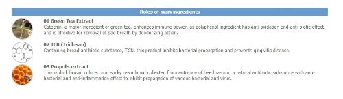 Green Tea Extract: Catechin, a major ingredient of green tea, enhances immune power, as polyphenol ingredient has anti-oxidation and anti-biotic effect, and is effective for removal of bad breath by deodorizing action.
