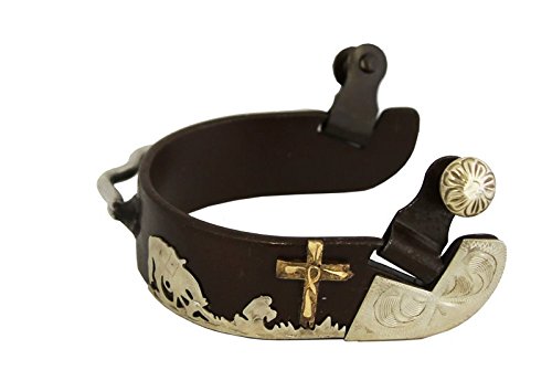 [Product Information]- Pair of brown steel humane bumper show spurs with praying cowboy and horse motif.