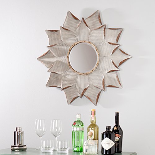 - Curling petals create dimension and shadows; round beveled mirror centers composition; sunflower shape adds soft country touch; aged finish will vary piece to piece for unique look