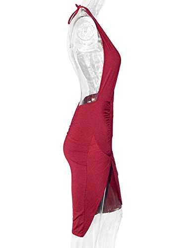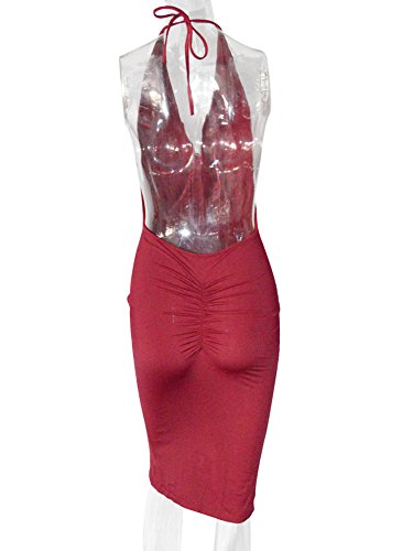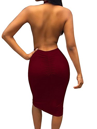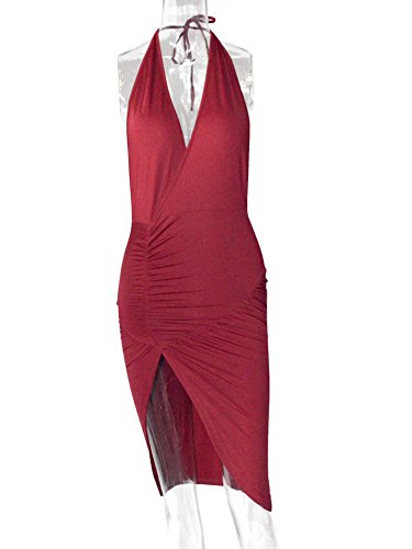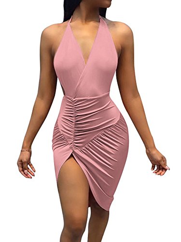 Halter, backless, v neck, high waist, side slit, bodycon, pleated design.