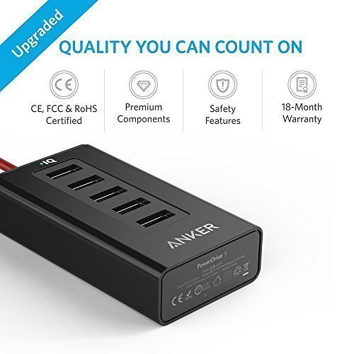 What You Get: Anker PowerDrive 5 (50W 5-port USB car charger), welcome guide, our fan-favorite 18-month warranty and friendly customer service.