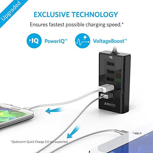 Fast Charging Technology: PowerIQ and VoltageBoost combine to provide the fastest possible charge up to 10 amps or 2.4 amps per port (Qualcomm Quick Charge 2.0 not supported. For QC 2.0 charging, please see Anker's 24W PowerDrive+ 1).