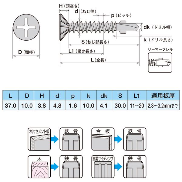 ●木片セメント板+鉄骨用ドリルビス 合板+鉄骨用ドリルビス 木+鉄骨用ドリルビス 窯業サイディング+鉄骨用ドリルビス
