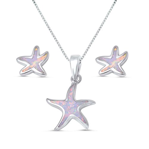 -. Title : Sterling Silver White Lab Opal Starfish Necklace and Earrings Set