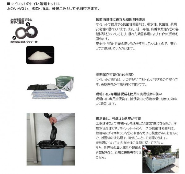 | 抗菌消臭性に優れた凝固剤を使用しています。約10年間の長期保存が可能。専用排便袋を使用しており、排便袋内で汚物の偏りを無くし効率よく凝固します。排泄後は可燃ゴミ処理が可能です。 |