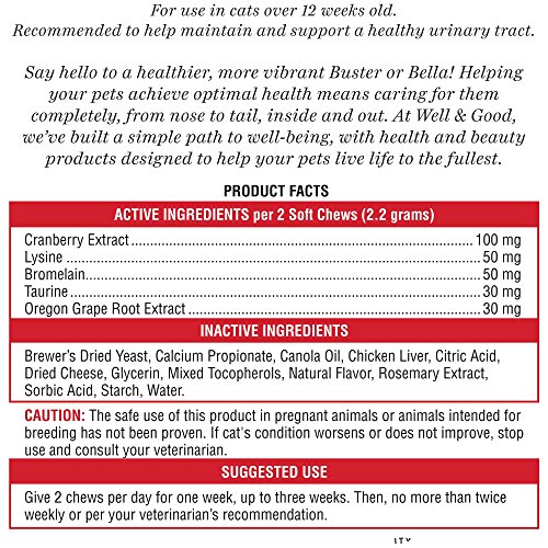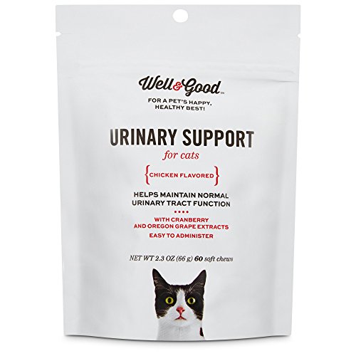 -. Binding : Misc. -. Brand : Well & Good -. EAN : 0800443981917 -. Feature : Helps maintain normal urinary tract function / Exceptional taste and high quality ingredients / Made with cranberry and oregon grape extracts / This item qualifies for free-shipping on Amazon.com for! Expires 7/13 11:59pm -. Label : Well & Good -. Manufacturer : Well & Good -. MPN : 44398191 -. PackageQuantity : 60 -. PartNumber : 44398191 -. ProductGroup : Pet Products -. ProductTypeName : PET_SUPPLIES -. Publisher : Well & Good -. Studio : Well & Good -. Title : Well & Good Urinary Support Cat Chews, Pack of 60 chews -. UPC : 800443981917