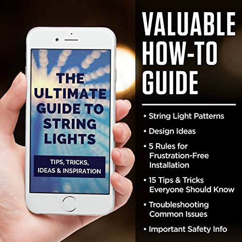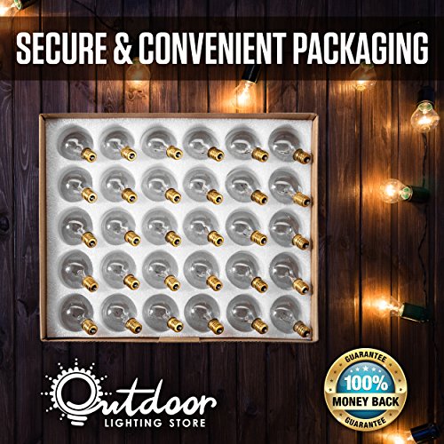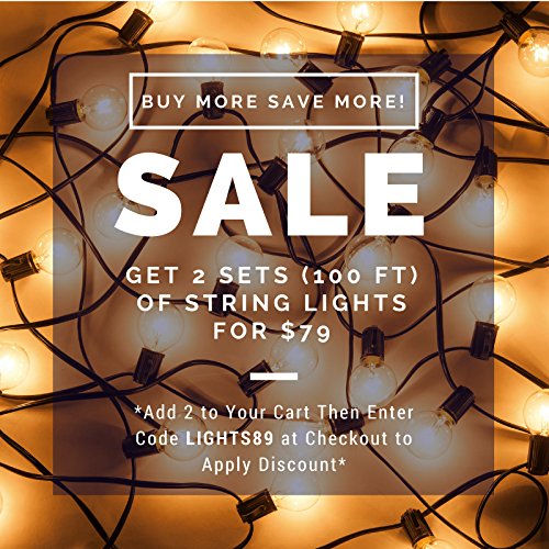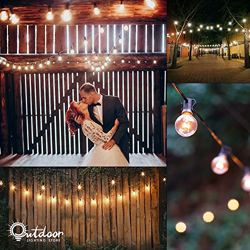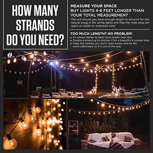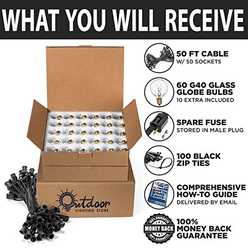 The Easiest Way To Create The Perfect Atmosphere You won't believe how much your indoor or outdoor space will change with these string lights. A warm and cozy ambiance, beautifully and discreetly lit, the ideal scenery for you to relax after a long day, have a glass of wine and something to eat in the company of loved ones. An opportunity to make your garden, patio, backyard or living room a place you long to spend time in.Bring A Dream Like Glow To Any Wedding, Party, or Event Instantly add a romantic touch to your wedding reception and imagine how beautiful your photos will look with these light strings charmingly lighting the background. Organize your birthday, anniversary, pool, garden or any possible kind of party, without thinking about detailed and excessive decorations - your string lights are all you need to create the perfect atmosphere for any event.Handled With Care All The WayEach set of string lights comes securely packaged ensuring it arrives intact. In the box, you'll find 1 50ft black cable and 60 clear G40 bulbs carefully packed in styrofoam to protect them in transit. In case you experience some small accidents, we include 10 extra bulbs so that you can use your set of 50 fully lit light bulbs to decorate your space without any annoying losses or hold ups.Product Specifications:Cable: 18AWGBulb Spacing: 12"Diameter of Bulb: 1.5"Bulb Type: G40 Socket Type: Fits E12 & C7Lead Length (both ends): 6"Lighted Length: 49 ftTotal Length (end to end): 50 ftTotal Watts Per String: 250100% Satisfaction GuaranteeWe strive to make every customer experience 5 stars, which is why all our products are covered by our 100% satisfaction guarantee. If for any reason you are not happy with the product or service you received, contact us and we will happily work with you to resolve any issue to your complete satisfaction.Feature