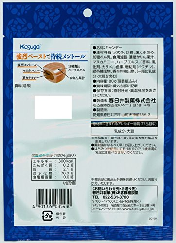 原材料:水あめ、砂糖、還元水あめ、加糖れん乳、食用油脂、濃縮かりん果汁、マヌカハニー、ハーブエキス/香料、乳化剤、カラメル色素、増粘剤(ペクチン)、緑茶抽出物、香辛料抽出物、(一部に乳成分・大豆を含む)
