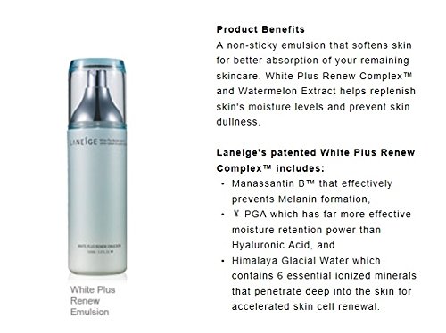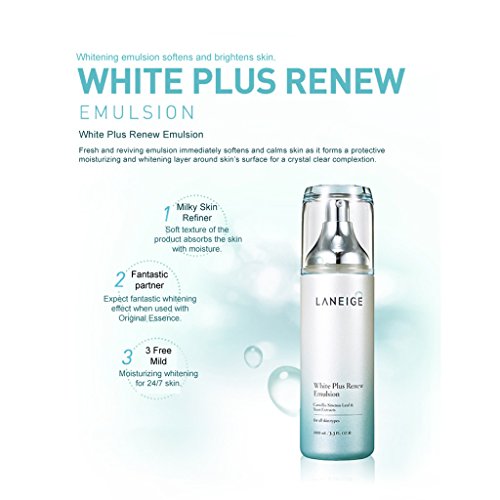-. Feature : Laneige White Plus Renew lsion / 3.38 Oz/100Ml / For All Skin / Day n Night / Non-sticky n Fresh-textured lsion Soften n Calms Skin / Instantly Supply the Whitening Moisture Barrier / Replenishes Moisture to Weary Skin