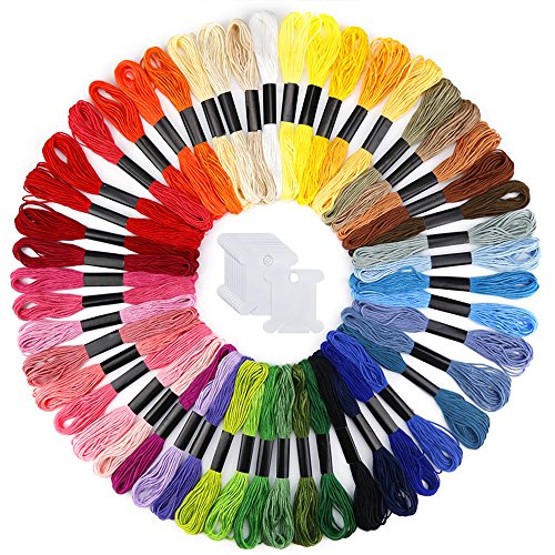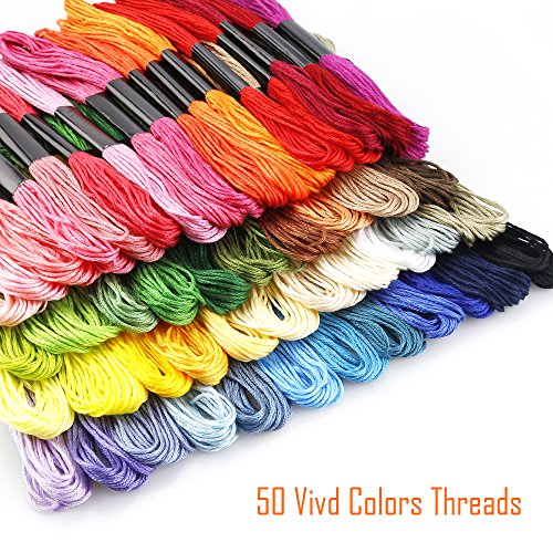 -. Feature : 50 different bright colors. Contains all the colors, blue, green, red, orange, pink, yellow, gray, black, white, etc., to meet your need for color / Made of soft, smooth polyester, more flexible, more durable, no worry about floss pilling and or falling apart, long storage time, can be applied long / Each Floss is about 8.75 yard long and each skein of embroidery floss comes in 6 threads. You can split the floss in accordance with your needs. Each Floss has a regular packing style, you don't have to rip out the wrapping paper, find the line head, pull it straight out, because the line can come out in sequence / Including 12pcs floss bobbins, with them, the rest of the line is wound around the board for the next use / The Cross Stitch Floss could be applied for making friendship bracelets, children's crafts, cross stitch projects, tassels, or any holiday decorations. Great for children, friends, moms, colleagues or cross stitch beginners or favors