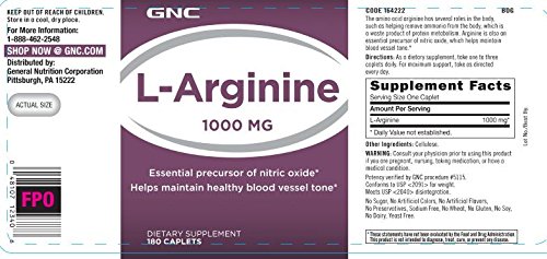 -. Binding : Health and Beauty -. Brand : GNC -. EAN : 0048107123406 -. Feature : Supplement Facts - Serving Size: 1 Caplet / Servings Per Container: 180 -. Label : GNC -. LegalDisclaimer : WARNING: Consult your physician P.R.Ior to using this product it you are pregnant, nursing, taking medication, under 18 years of age or have a medical condition. Discontinue use two weeks P.R.Ior to surgery.KEEP OUT OF REACH OF CHILDREN. -. Manufacturer : GNC -. Model : No Model Number -. MPN : No Part Number -. PackageQuantity : 1 -. PartNumber : No Part Number -. ProductGroup : Health and Beauty -. ProductTypeName : HEALTH_PERSONAL_CARE -. Publisher : GNC -. Size : 180 servings -. Studio : GNC -. Title : GNC L-Arginine 1000MG 180 Caplets -. UPC : 048107123406