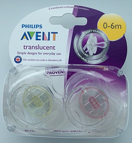 -. Feature : 2 x Avent Soothers / Orthodontic, symmetrical collapsible silicone teat / Snap-on protective cap / User-friendly silicone teats / Age: 0-6m