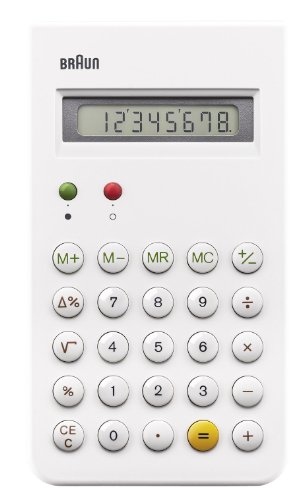 -. Binding : Office Product -. Brand : Braun -. Color : White -. EAN : 5013348612595 -. Feature : This Braun calculator is a replica of the Braun ET66 calculator, one of Braun's most iconic designs, which was collaboratively designed by Dietrich Lubs and Dieter Rams and originally released in 1987. / Automatic power off / The Braun ET66 calculator is considered to be the pinnacle of the "less but better" philosophy thanks to its simple, rectangular design with convex, circular buttons. / Protective slide cover / 8 digit operating capacity -. IsEligibleForTradeIn : 1 -. Label : Braun -. Manufacturer : Braun -. Model : BNE001WH -. MPN : BNE001WH -. PackageQuantity : 1 -. PartNumber : BNE001WH -. ProductGroup : Office Product -. ProductTypeName : OFFICE_PRODUCTS -. Publisher : Braun -. Studio : Braun -. Title : Braun - Calculator - White - BNE001WH