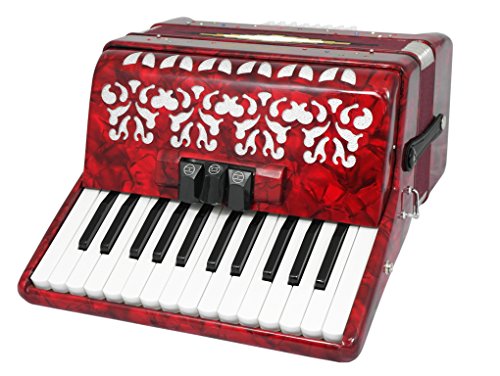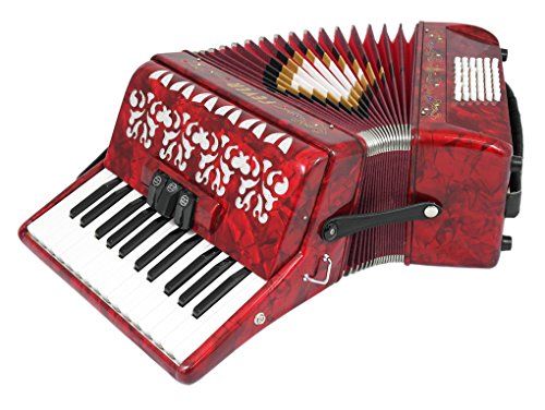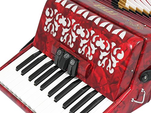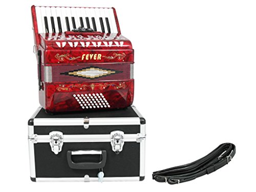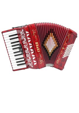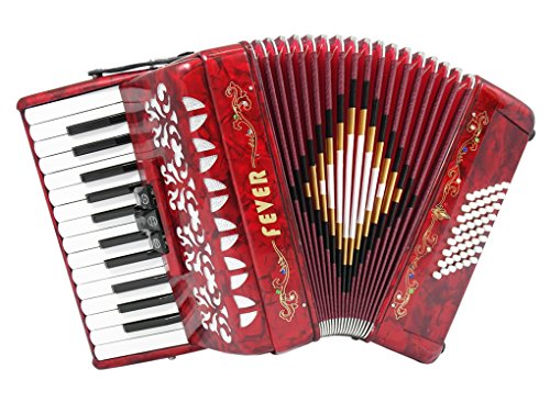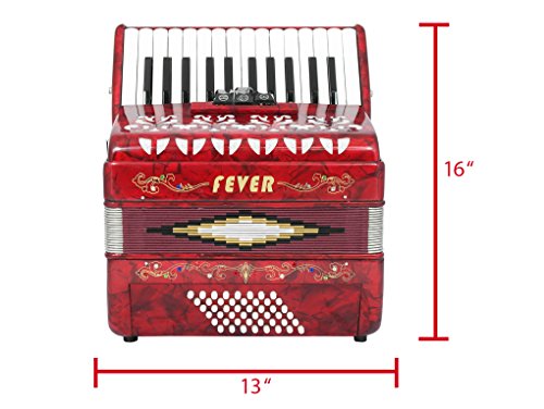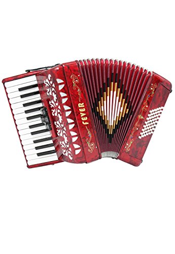 Studio : Fever Publisher : Fever Binding : Electronics Product Description This Beautiful Fever Piano Accordion 3 Switches 26 Piano Treble Keys 48 Bass button accordion has everything you may need and more. Features 26 full chromatic piano melody keys enough to play all the songs you want, 48 Bass/Chords buttons for harmony and accompaniment, 3 switches that provide warm, and even tone. Features Italian Style decorations and pearlescent colors. There are single straps hooks on each side of the accordion with plenty of room for the two extra PU leather padded shoulder straps included. The bellows are 18 fold in size for bigger sound and have sheepskin corners for longer life. The acoustically designed grill cloth provides a bigger sound than most other comparable accordions. A slide lever air valve makes for faster air intake. The accordion comes with a premium case with lock, and a set of keys. Accordion Dimensions: 13 inches in Length, 16 inches Height and 7 inches width. Accordion weight 13 lbs approximately. 0