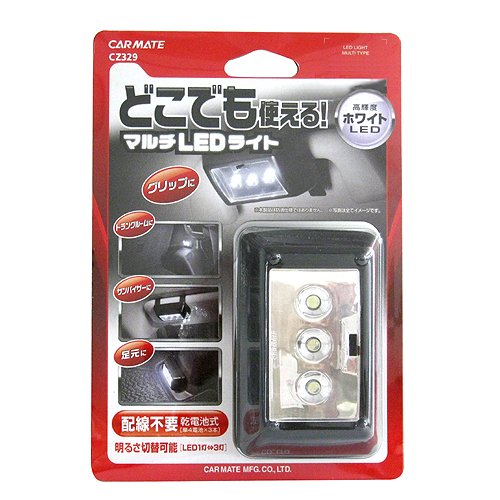 ● Recommended as a torchlight in the car ● High-brightness white LED light of convenient battery type without wiring required ● Illuminate dark trunk room and feet ● Handy size, so it can be used as work etc ● Mounted on sun visor and assist grip