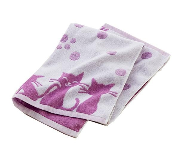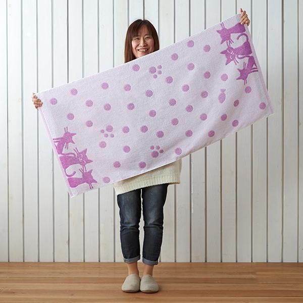 日本3大タオル産地のひとつである今治産。工場の閑散期に製造してお求めやすい価格に。かわいいネコとドット柄のキュートなデザインのバスタオルです。