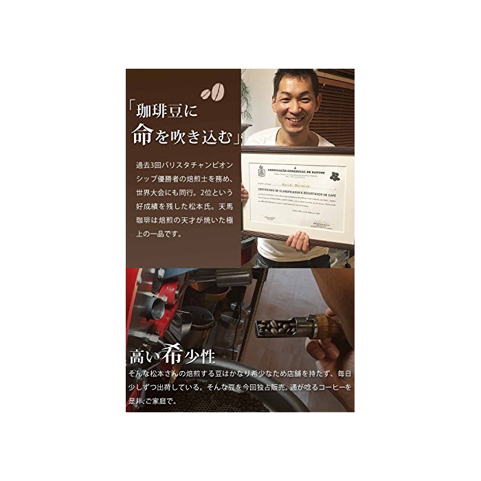 【 일본 제일3회의 배전사 】마츠모토씨는,과거3회 바리 스타 챔피언 쉽 우승자의 배전사를 맡았습니다.천마커피는 그런 배전의 천재가 구웠 엄선한 일품입니다.