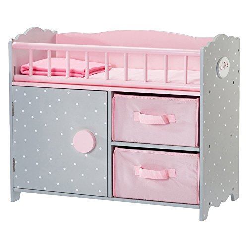 Doll nursery furniture, can be a doll crib, and also doll changing station, includes a pink blanket, cabinet, and 2 storage bins. Side rail removable