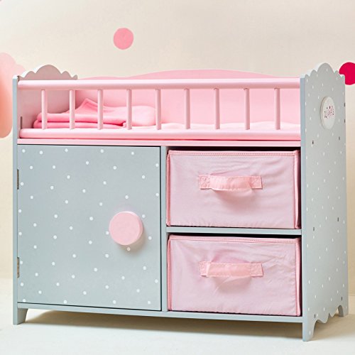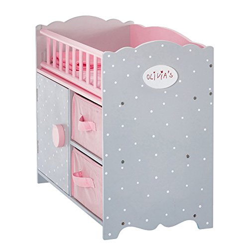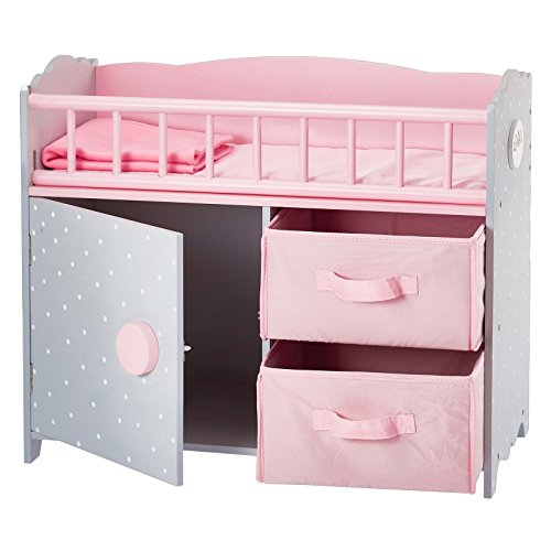 Looking to provide your dolls with a stylish sleeping space and make storing their belongings simple? Why not try out our crib with cabinet and cubby. This multifunction unit features a cozy place for baby doll to sleep and handy storage space below with door and pink felt baskets with handle that slide out, to store onesies, extra diapers, and much more!.Feature