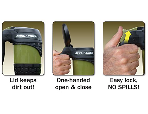 - LOCKING LID / OPERABLE WITH ONE HAND - The Rough Rider Mug is equipped with an open and close locking mechanism that helps to keep dirt out and the contents of the mug in! While the locking mechanism sounds intimidating, it is EASILY operated with one hand (LEFTY or RIGHTY), so you can keep working or driving without having to stop what you’re doing to use both your hands!