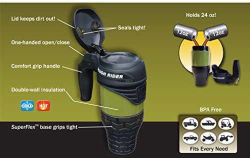- DESIGNED FOR OFF-ROAD - Perfect for off road vehicles such as tractors, pickup trucks, RVs, ATV's, forklifts, cranes, backhoes, bulldozers, golf carts, boats and more. Keeps your drink secure will riding your Husqvarna, Cub Cadet, Craftsman or John Deer lawn mowers. Even with all the dirt being kicked up the lid will protect the mouthpiece from getting covered with dirt.